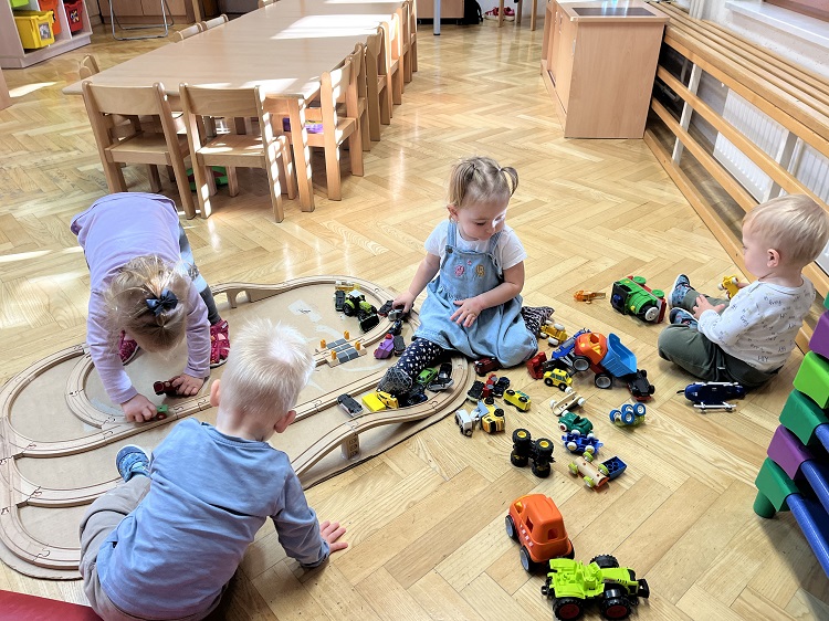 Tudi v najmlajši skupini smo doživeli pestro in igrivo dogajanje. Otroci so se veliko igrali z različnimi prevoznimi sredstvi, skupaj smo sestavljali cesto in železnico. Ob glasbi »Kolesa na avtu se okrog vrte«, smo se veselo gibali, pri likovni dejavnosti pa je vsak ustvaril svoj avtomobil. Spoznali smo tudi bibarijo »Moj rdeči avto«.