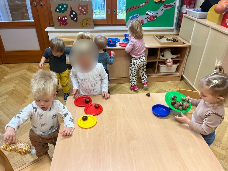 Spoznavali smo jesenske plodove – buče, koruzo, kostanj in orehe. Z njimi smo se igrali, jih prenašali, kotalili, razvrščali in šteli.