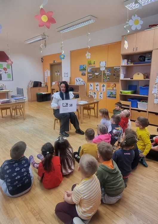 Otroci so z zanimanjem prisluhnili pravljicam Medvedkova knjižnica in Podkovana žaba ter imeli možnost prelistati revije Cicido.