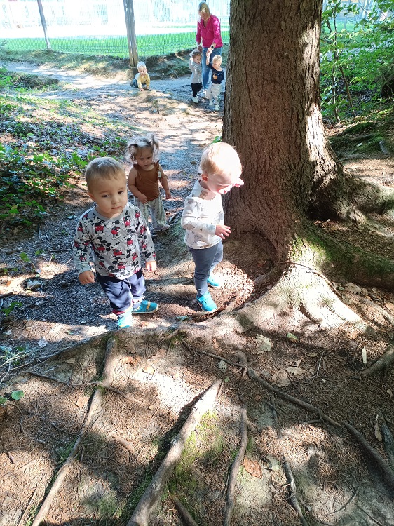 V mesecu septembru smo imeli v skupini dva uvajanja. Deklici sta se hitro uvedli, zato smo kar kmalu lahko pričeli z raziskovanjem – gozdnim raziskovanjem. Večino časa smo preživeli v gozdu, kjer smo razvijali svoje ravnotežje, urili svoje noge in krepili mišice. Skakali smo čez korenine, plezali preko hlodev, kopali luknje, tekli in se skrivali. Hodili smo na sprehode, kjer smo vsem pokazali, kako “veliki” smo že, saj nam tudi hoja v paru ni več tuja.