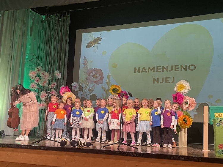 V torek, 17. marca se je naš vrtec predstavil na prireditvi Namenjeno njej, in sicer z nastopom pevskega zbora Iskrice pod vodstvom Katarine Hren Lajhar in Polonce Flis Pekovšek. Za dodatek scenskega dela pevskega nastopa je s svojo ustvarjalnostjo poskrbela Mateja Gošnik. S ponosom, kančkom pozitivne treme in velikim zaupanjem v strokovne delavke in otroke smo čakali začetek prireditve, ki jo je otvoril prav naš pevski zbor. Najmlajši, a zato nič manj pogumni so nastop suvereno opravili in še enkrat zablesteli na odru. Hvala občini za vabilo, staršem za udeležbo in sodelovanje, strokovnim delavkam za vložen trud in predanost ter seveda našim otrokom za polepšan torkov popoldan.