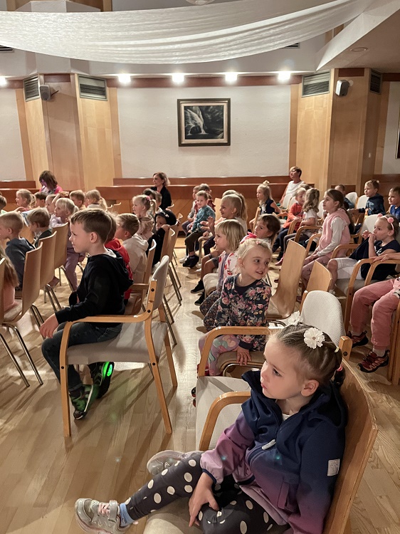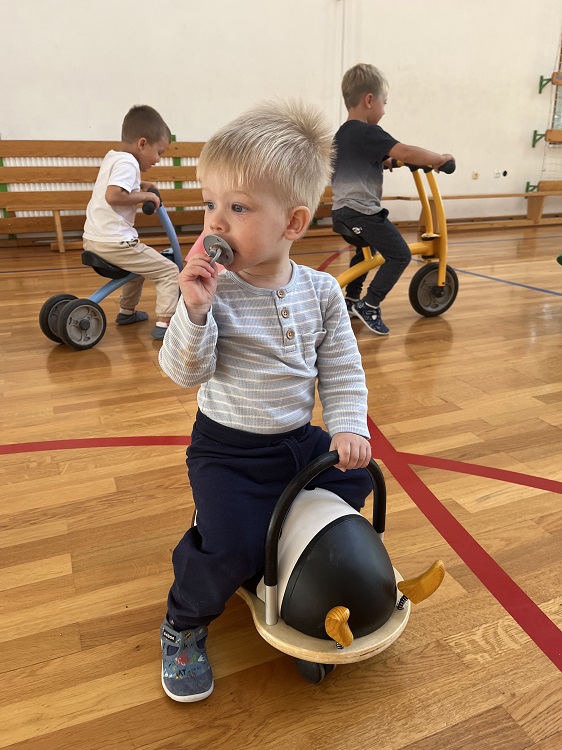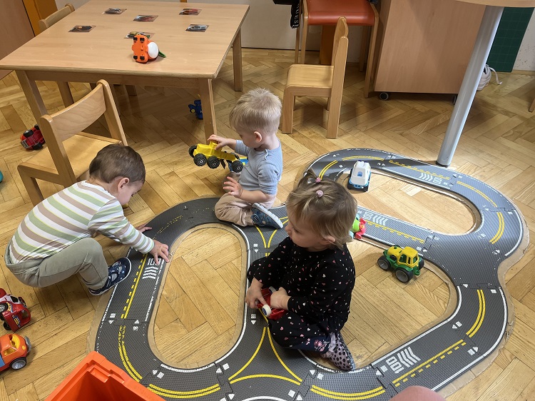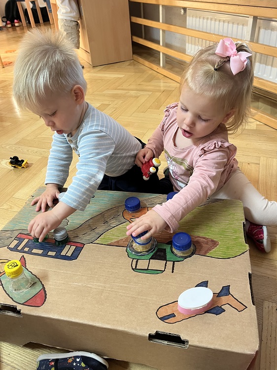 Tudi v najmlajši skupini smo doživeli pestro in igrivo dogajanje. Otroci so se veliko igrali z različnimi prevoznimi sredstvi, skupaj smo sestavljali cesto in železnico. Ob glasbi »Kolesa na avtu se okrog vrte«, smo se veselo gibali, pri likovni dejavnosti pa je vsak ustvaril svoj avtomobil. Spoznali smo tudi bibarijo »Moj rdeči avto«.