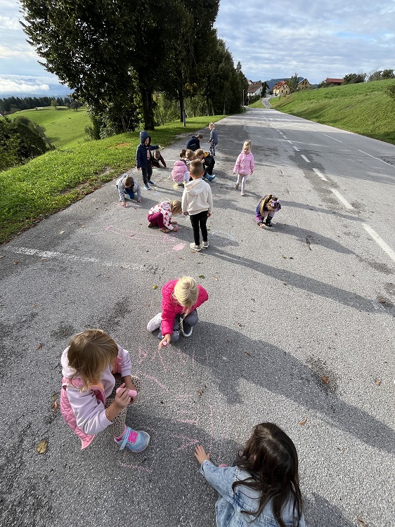 Risali smo s kredami, spodbujali trajnostni prihod v vrtec s sivim zajčkom. Urili smo se v varnem prečkanju ceste: vadba pravilnega prečkanja, hoja ob cestišču in pločniku ter prepoznavanje prometnih znakov.