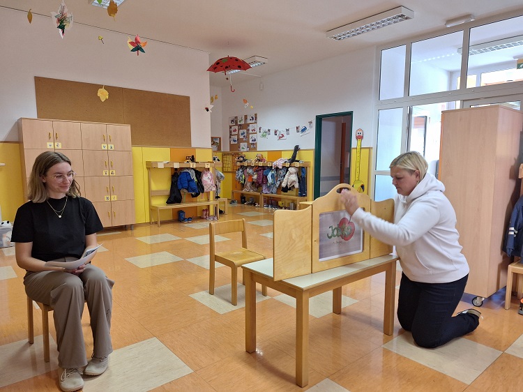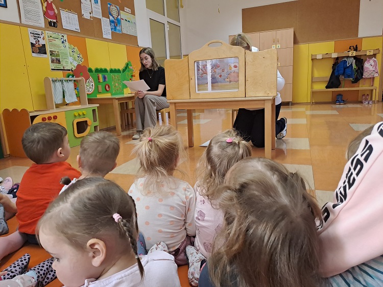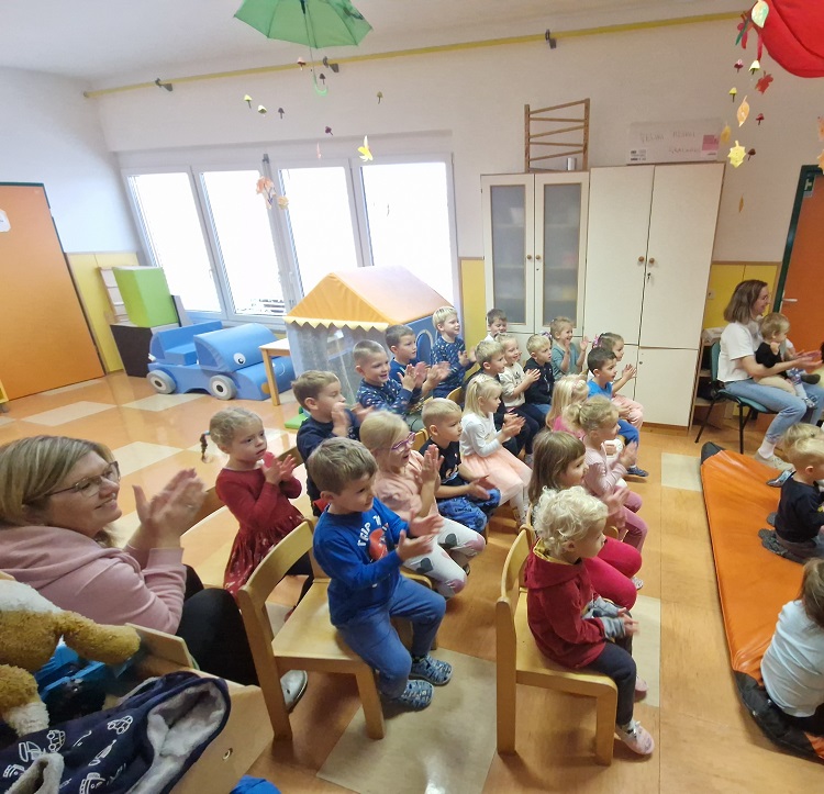 S sosednjimi skupinami smo se družili ob prepevanju otroških pesmic o jeseni, ki so nam ogrele srca, ter prisluhnili kamišibaj pravljici “Jabolko” (A. Štefan). Ob tem smo se veliko pogovarjali o prijaznosti – kaj pomeni, kako jo lahko pokažemo in zakaj je pomembna vsak dan.