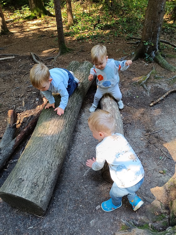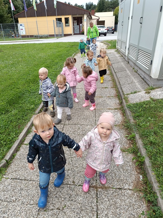 V mesecu septembru smo imeli v skupini dva uvajanja. Deklici sta se hitro uvedli, zato smo kar kmalu lahko pričeli z raziskovanjem – gozdnim raziskovanjem. Večino časa smo preživeli v gozdu, kjer smo razvijali svoje ravnotežje, urili svoje noge in krepili mišice. Skakali smo čez korenine, plezali preko hlodev, kopali luknje, tekli in se skrivali. Hodili smo na sprehode, kjer smo vsem pokazali, kako “veliki” smo že, saj nam tudi hoja v paru ni več tuja.
