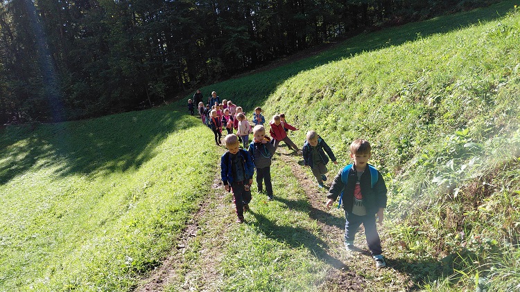 Jesen nas kliče po potepanju v naravi in raziskovanju gozda. Tako smo se tudi mi odpravili na jesenski pohod. Prehodili smo del Srčkove učne poti, ki je v okolici vrtca. Pot nas je iz vrtca vodila skozi naš park v Zrečah, mimo zreškega jezera in čez potok v gozd. Da smo bili na pravi poti, so nas opozarjale rumene puščice z napisom Srčkova učna pot. Po gozdni poti smo srečali močerada, pobirali kostanj, listje, videli gobe. Hodili smo po blatu, koreninah, skakali čez potoček. Gozdni škrat je pripravil presenečenje. Na cilju smo se okrepčali z malico in vodo iz nahrbtnikov. Ko smo bili siti, smo se na gozdni jasi igrali, raziskovali, nato pa smeti pospravili v nahrbtnike in se odpravili polni novih vtisov nazaj v vrtec.