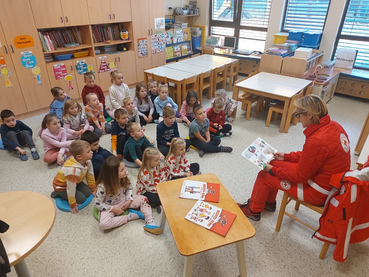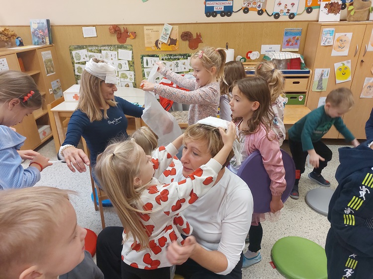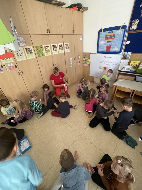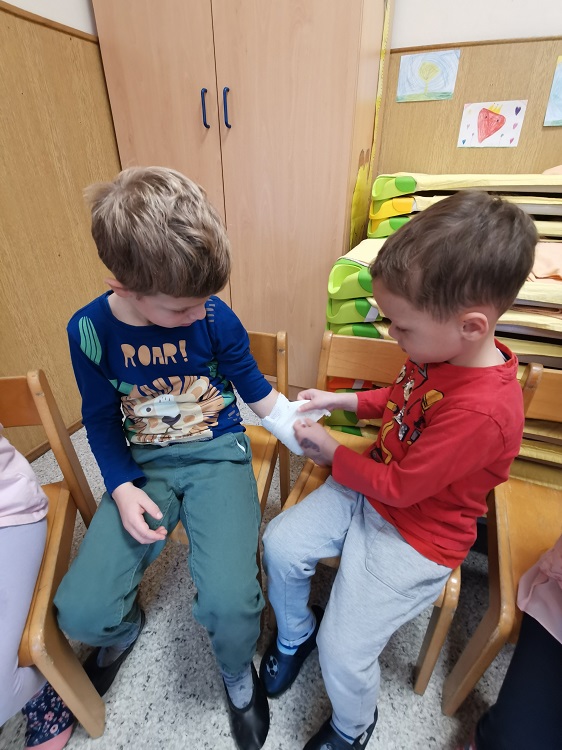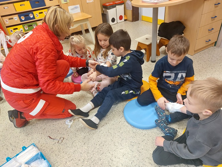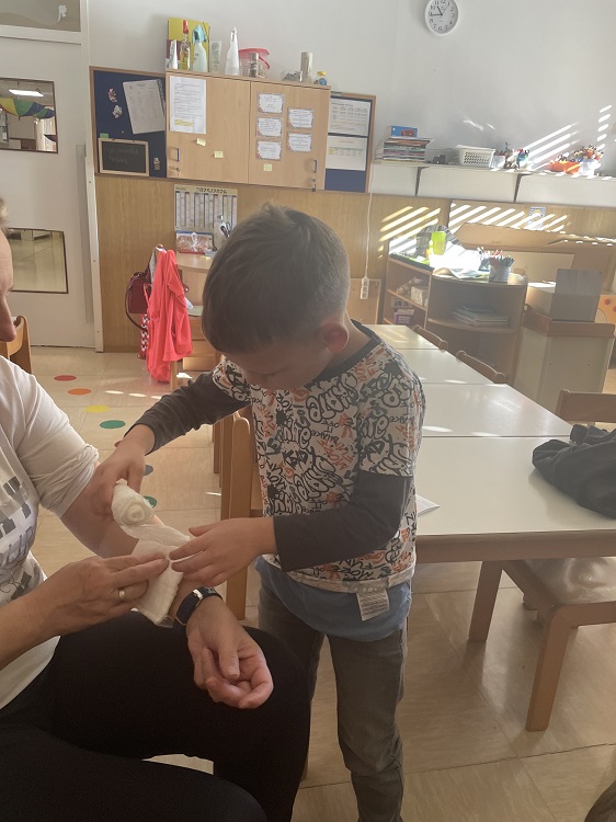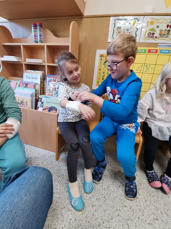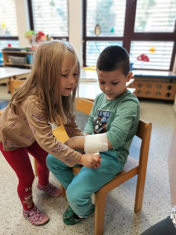 V tednu solidarnosti Rdečega križa, ki ga vsako leto obeležujemo od 1. do 8. novembra, nas je obiskala srčna in predana prostovoljka ga. Petra iz Območnega združenja Rdečega križa Slovenske Konjice. Otrokom treh predšolskih skupin v Vrtcu Zreče je predstavila zanimive delavnice ter otroke seznanila s pomembnimi in humanimi akcijami. Otrokom je prikazala tudi kako reagirati in kako si ob manjših poškodbah lahko pomagamo tudi sami doma. Torej, kako se strokovno nudi prva pomoč. Predstavila je svojo torbo s prvo pomočjo in otrokom podrobneje pokazala, kako se povije rana ob manjših poškodbah. Največje veselje je bilo, ko so si otroci v parih tudi sami previjali navidezne poškodbe.