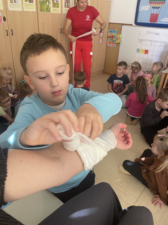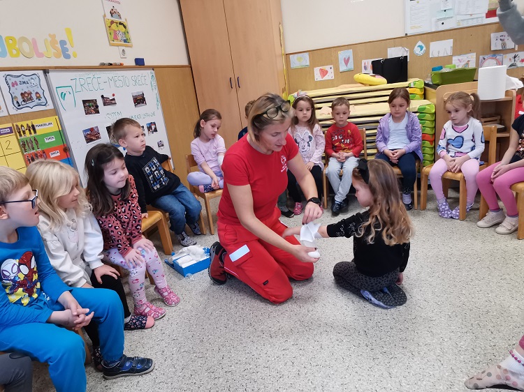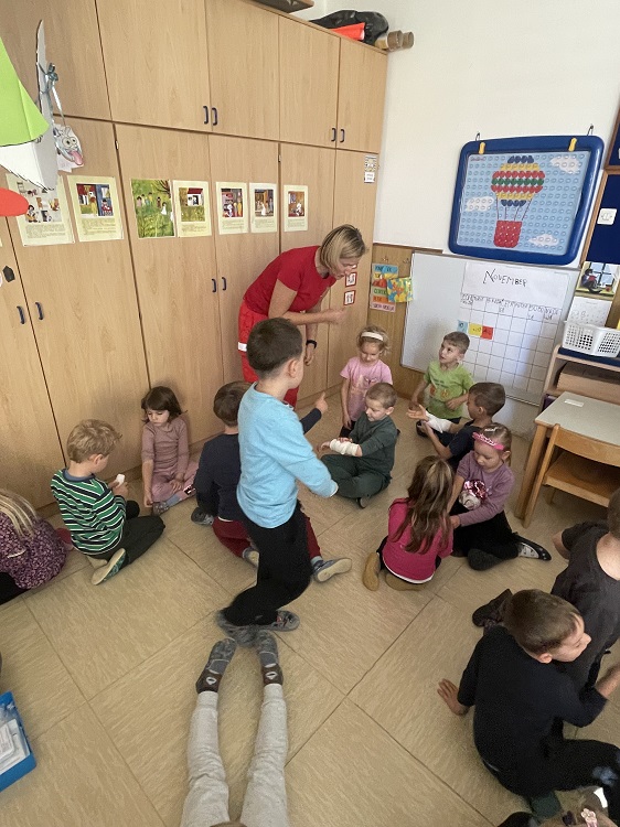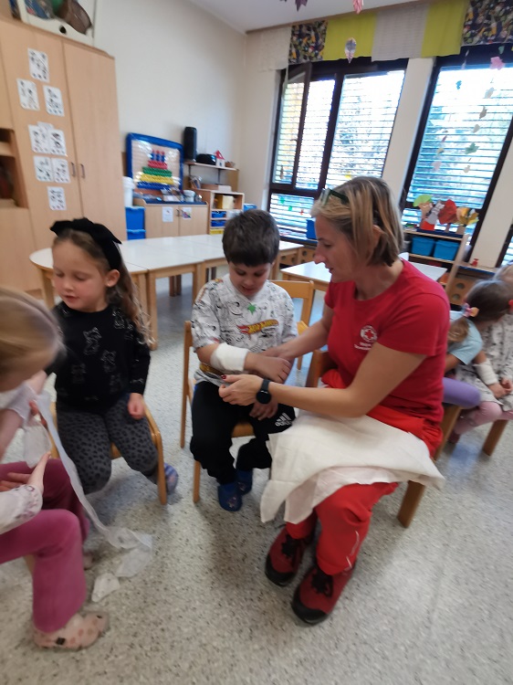 V tednu solidarnosti Rdečega križa, ki ga vsako leto obeležujemo od 1. do 8. novembra, nas je obiskala srčna in predana prostovoljka ga. Petra iz Območnega združenja Rdečega križa Slovenske Konjice. Otrokom treh predšolskih skupin v Vrtcu Zreče je predstavila zanimive delavnice ter otroke seznanila s pomembnimi in humanimi akcijami. Otrokom je prikazala tudi kako reagirati in kako si ob manjših poškodbah lahko pomagamo tudi sami doma. Torej, kako se strokovno nudi prva pomoč. Predstavila je svojo torbo s prvo pomočjo in otrokom podrobneje pokazala, kako se povije rana ob manjših poškodbah. Največje veselje je bilo, ko so si otroci v parih tudi sami previjali navidezne poškodbe.