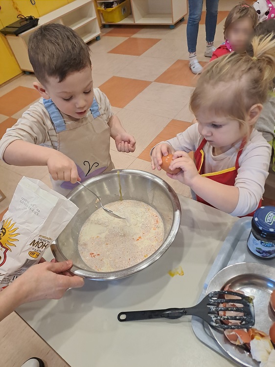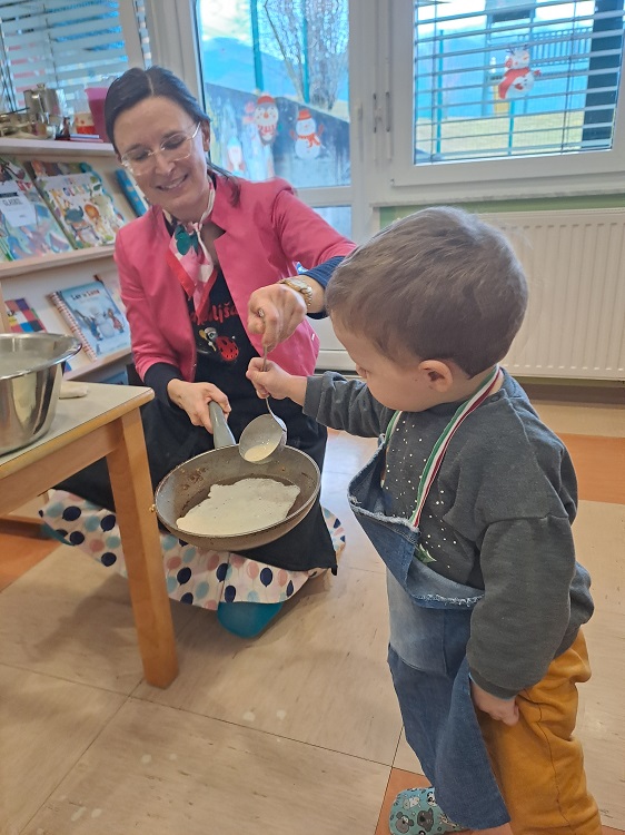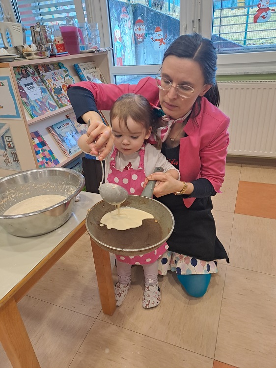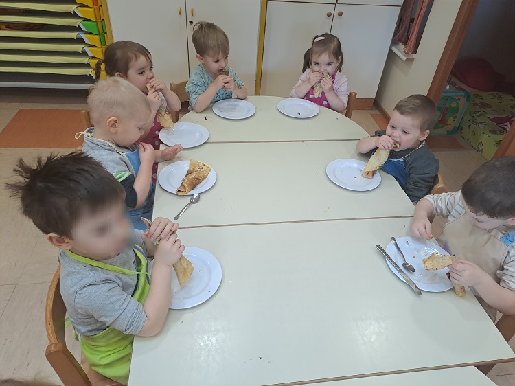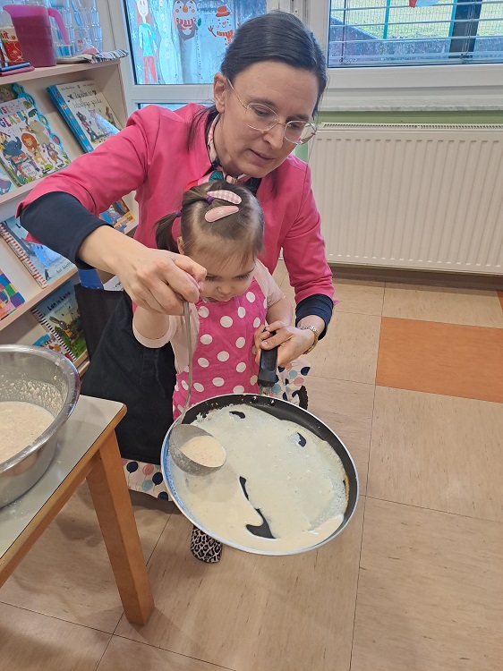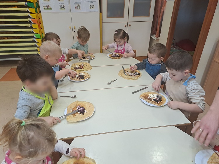 V našem vrtcu smo preživeli prijetno in ustvarjalno dopoldne ob peki zdravih palačink. Tokrat smo skupaj z zaposleno organizatorko prehrane, ga. Petro pripravili palačinke iz polnozrnate moke, s čimer smo otrokom približali pomen zdrave prehrane.