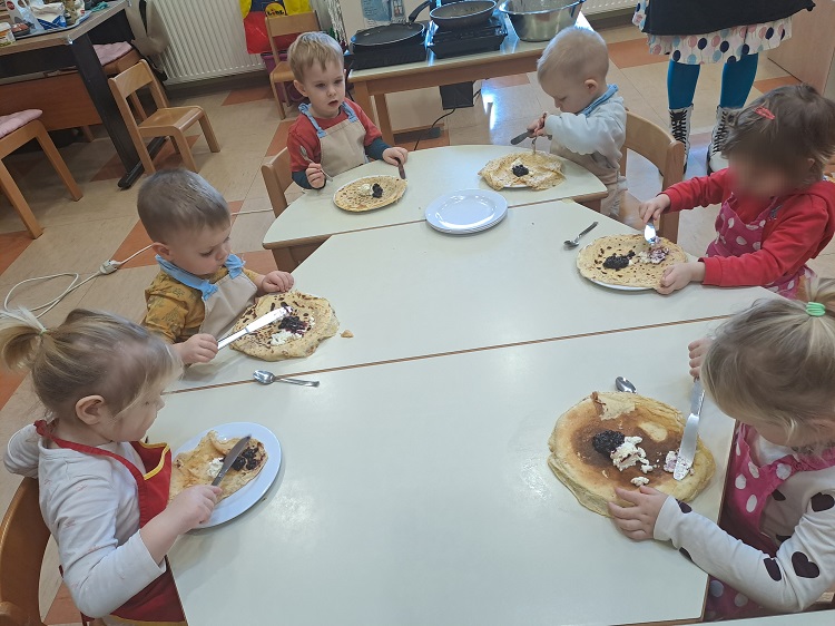 Otroci so aktivno sodelovali pri pripravi mase, opazovali peko palačink ter se ob tem pogovarjali o sestavinah in postopku. Posebno veselje pa je sledilo pri mazanju palačink z zdravim nadevom iz skute in borovničevega džema. Otroci so si palačinke sami mazali, kar je spodbujalo samostojnost, fino motoriko in ustvarjalnost. Palačinke smo seveda tudi z veseljem pojedli. Dopoldne je minilo v sproščenem in veselem vzdušju, polnem smeha in sladkih (a zdravih) okusov. Takšne dejavnosti so nam vsem omogočale učenje skozi izkušnjo ter okrepile pozitivne prehranske navade.